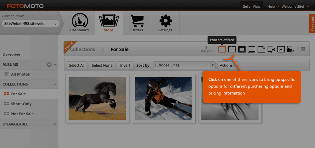 In your SiteWelder SiteManager, you can easily enable Fotomoto in your image galleries. In the gallery editing area, you can enable Fotomoto for all images in one click or you can individually toggle on and off individual images for sale.